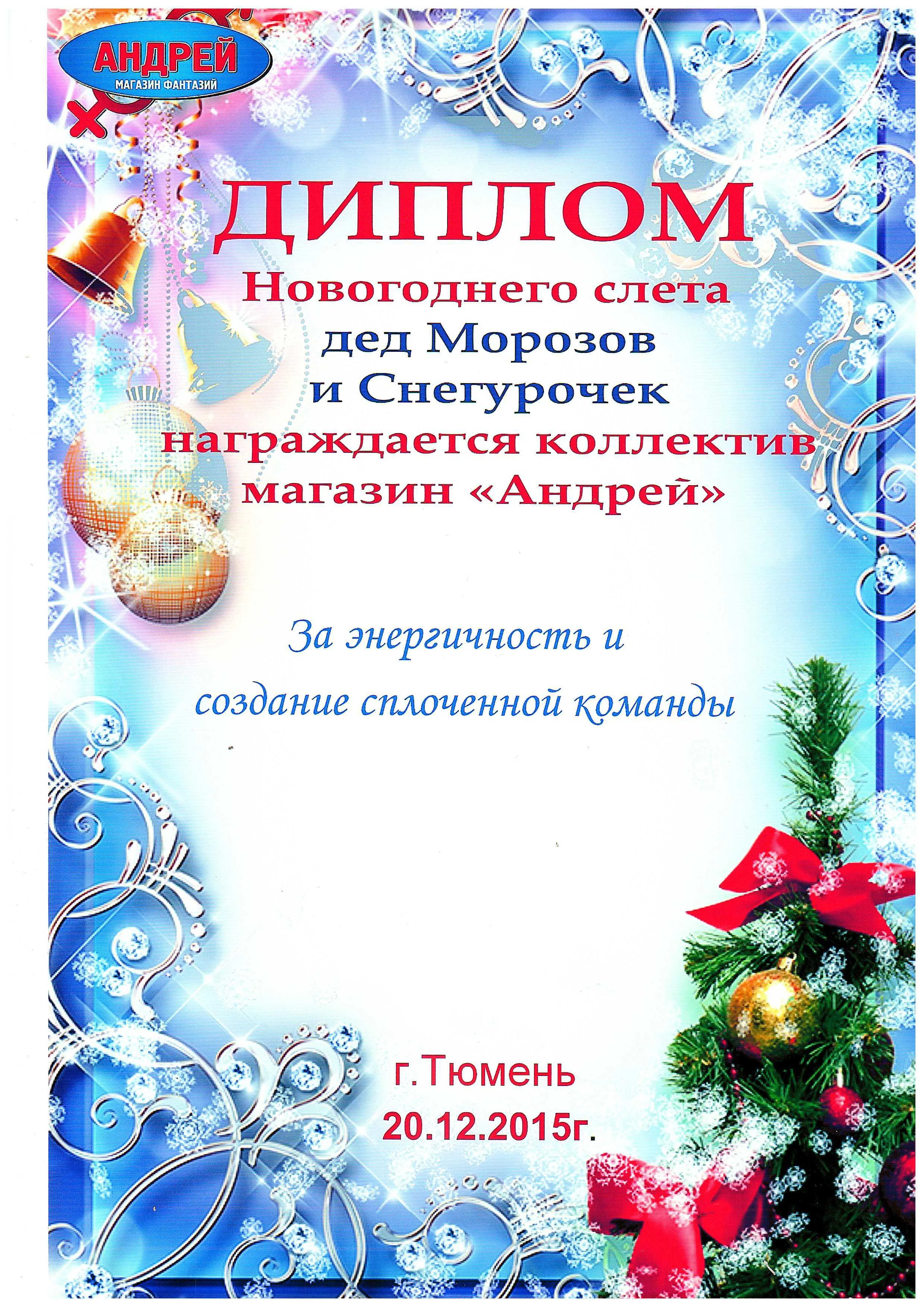 Диплом новогоднего слета дед Морозов и Снегурочек. Награждается коллектив магазина "Андрей" за энергичность и создание сплоченной команды. г. Тюмень 20.12.2015 г.