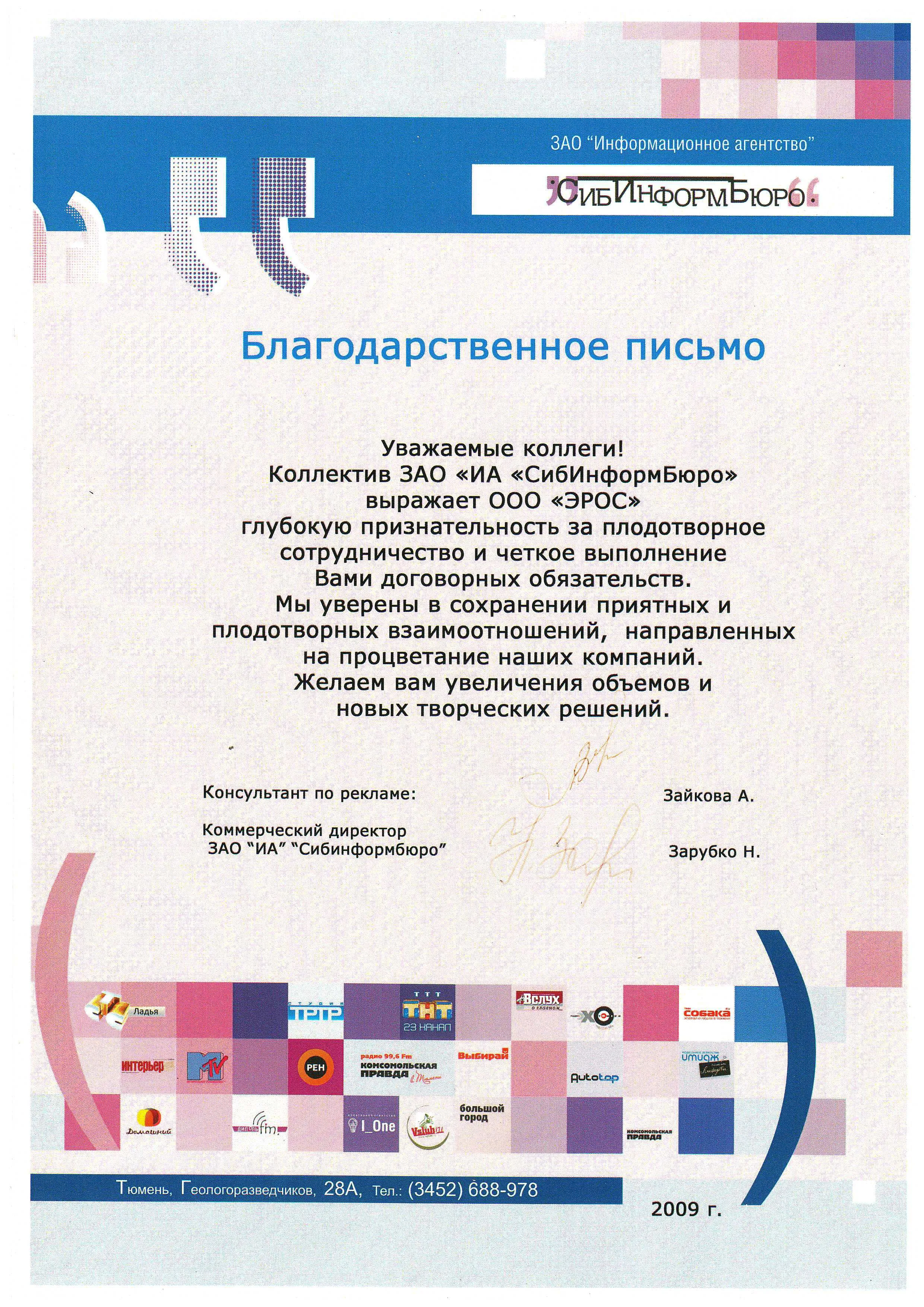 Благодарственное письмо от ЗАО "ИА "СибИнформБюро" 2009 г.