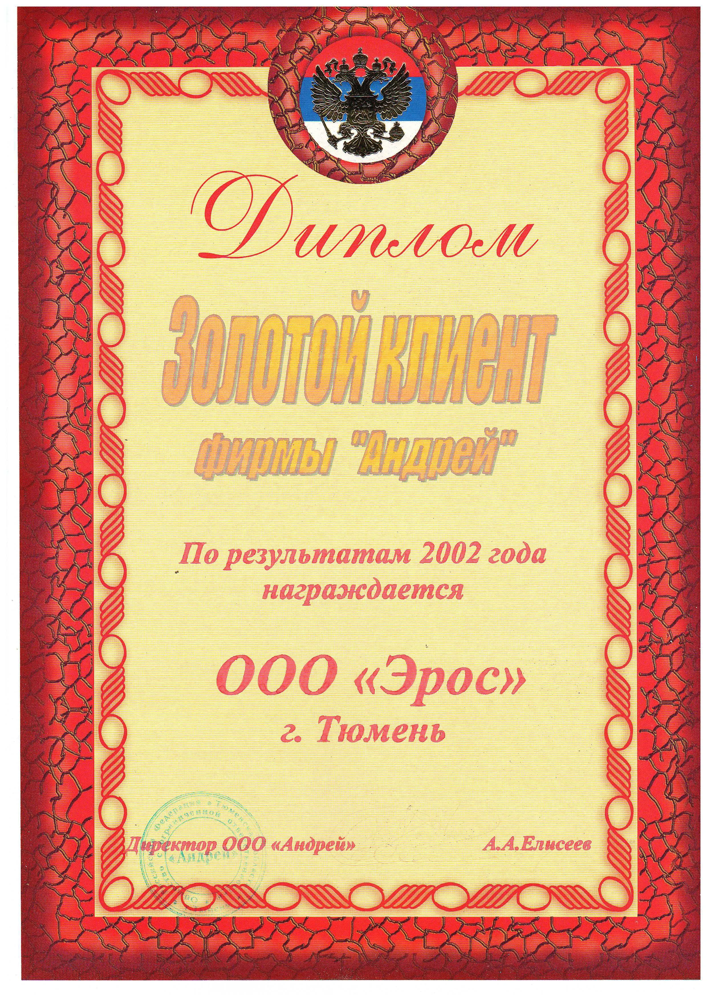 Награждается ООО "Эрос" в номинации Золотой клиент фирмы "Андрей" по результатам 2002 года.