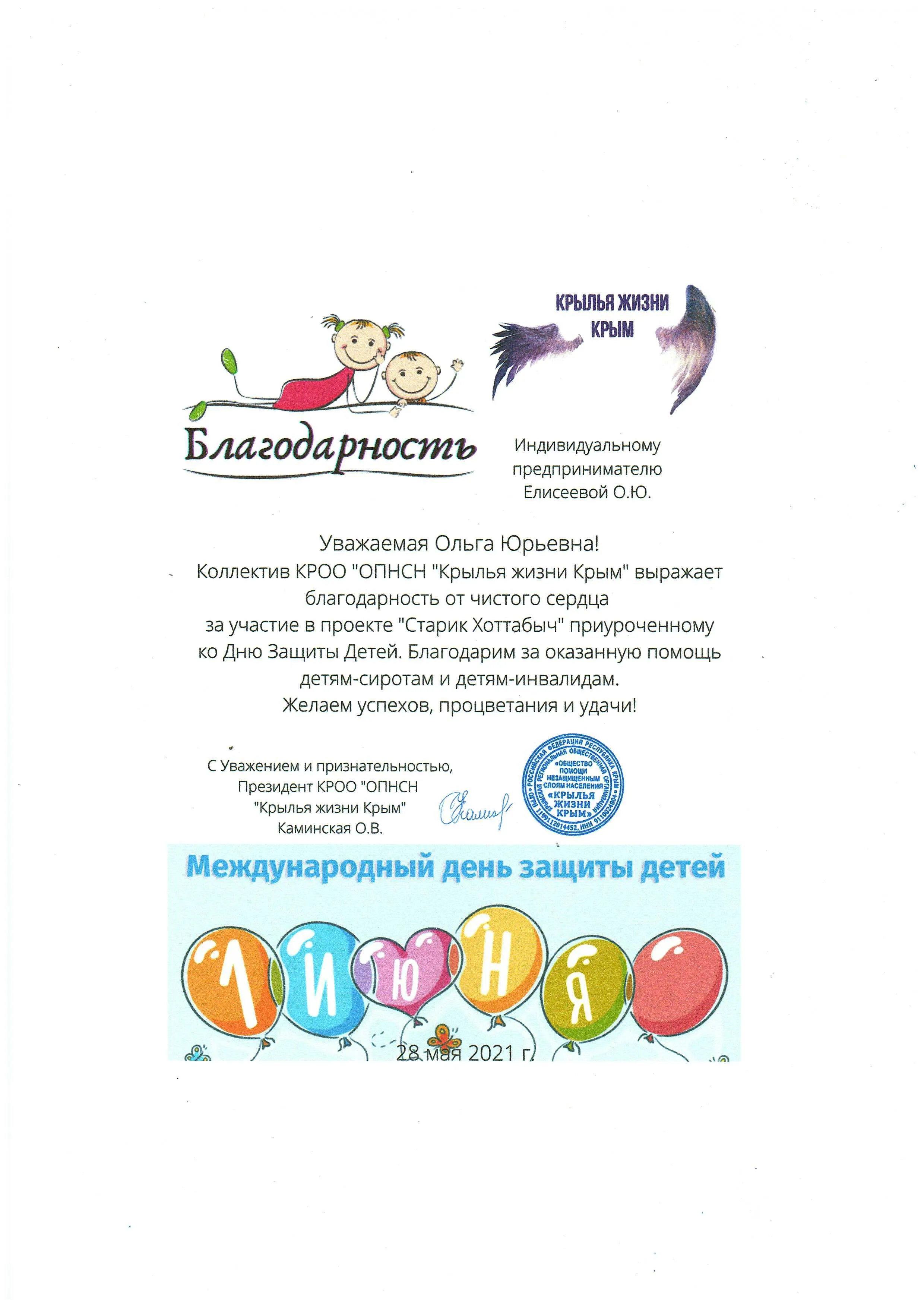 Коллектив КРОО "ОПНСН "Крылья жизни Крым" выражает благодарность от чистого сердца за участие в проекте "Старик Хоттабыч", приуроченному ко дню защиты детей. Благодарим за оказанную помощь детям-сиротам и детям-инвалидам.