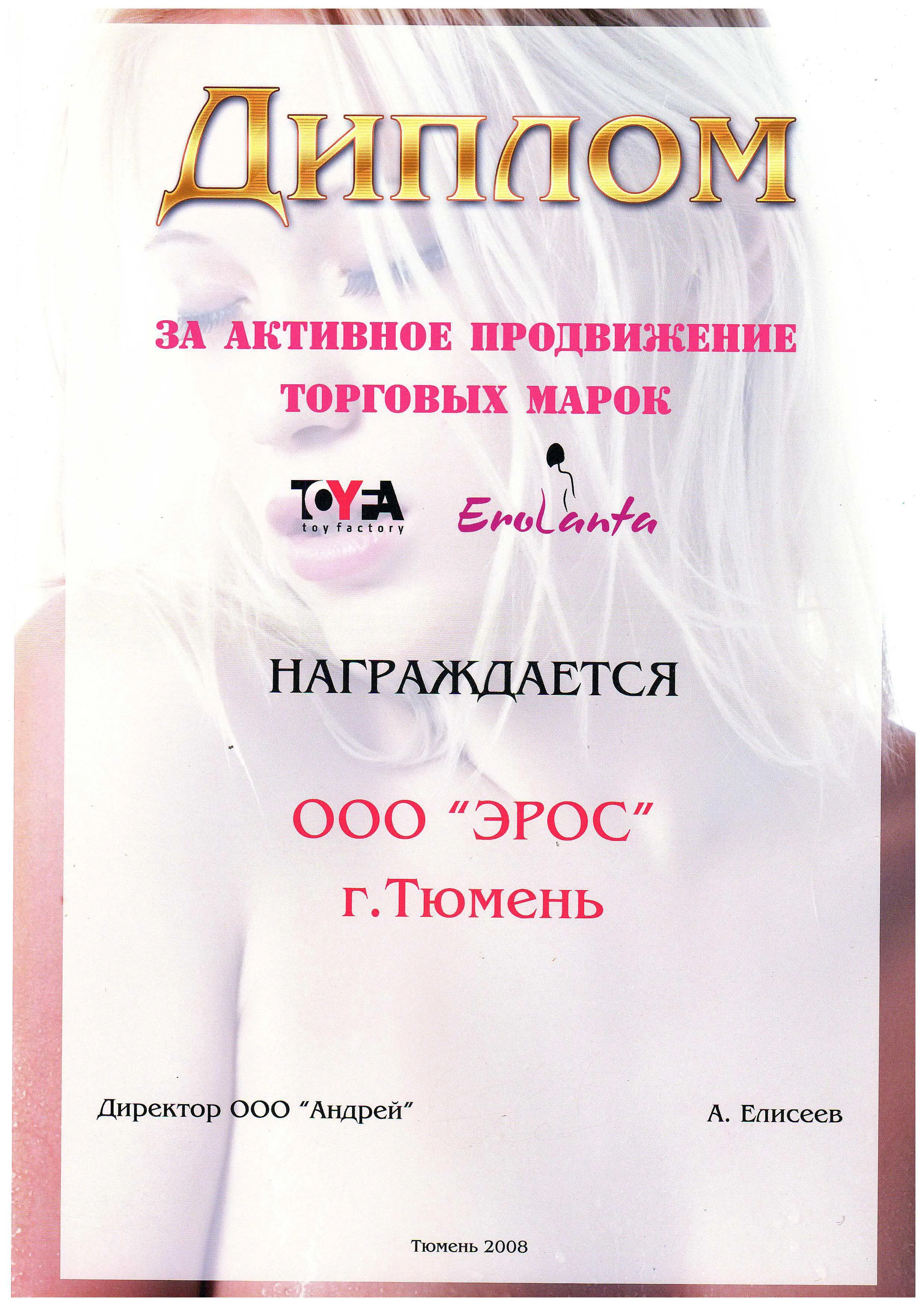 Диплом за активное продвижение торговых марок TOYFA и EroLanta 1.4 мб