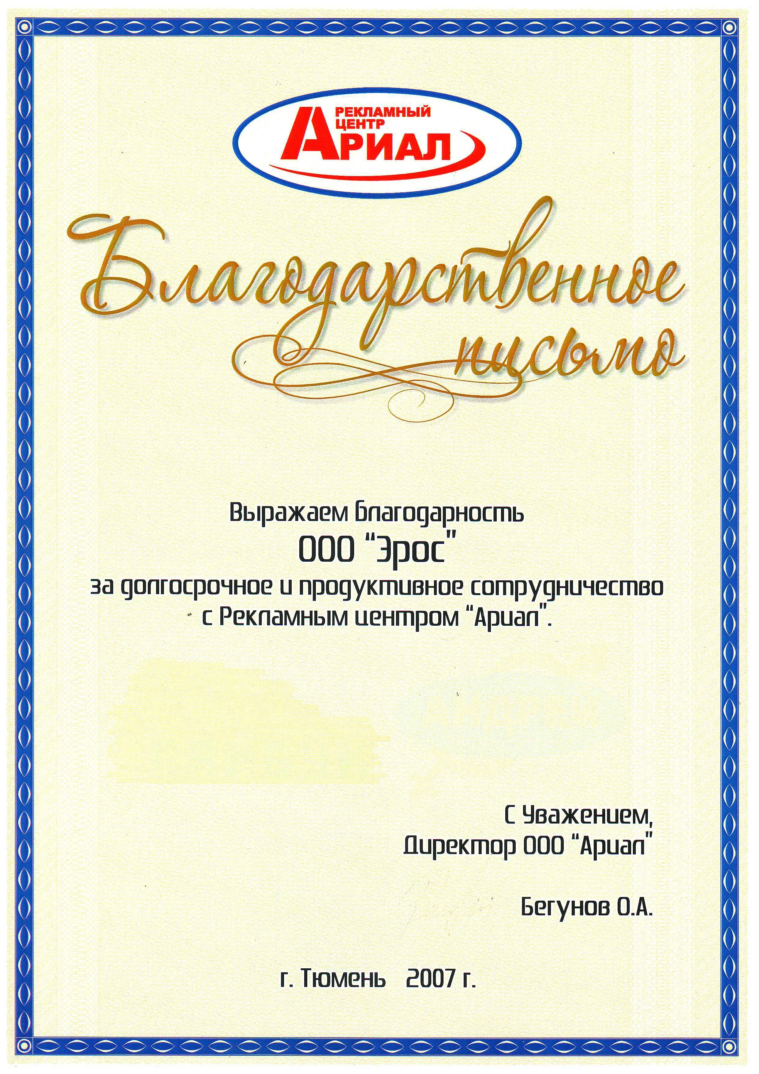 Благодарственное письмо от ООО "Ариал" 1.5 мб