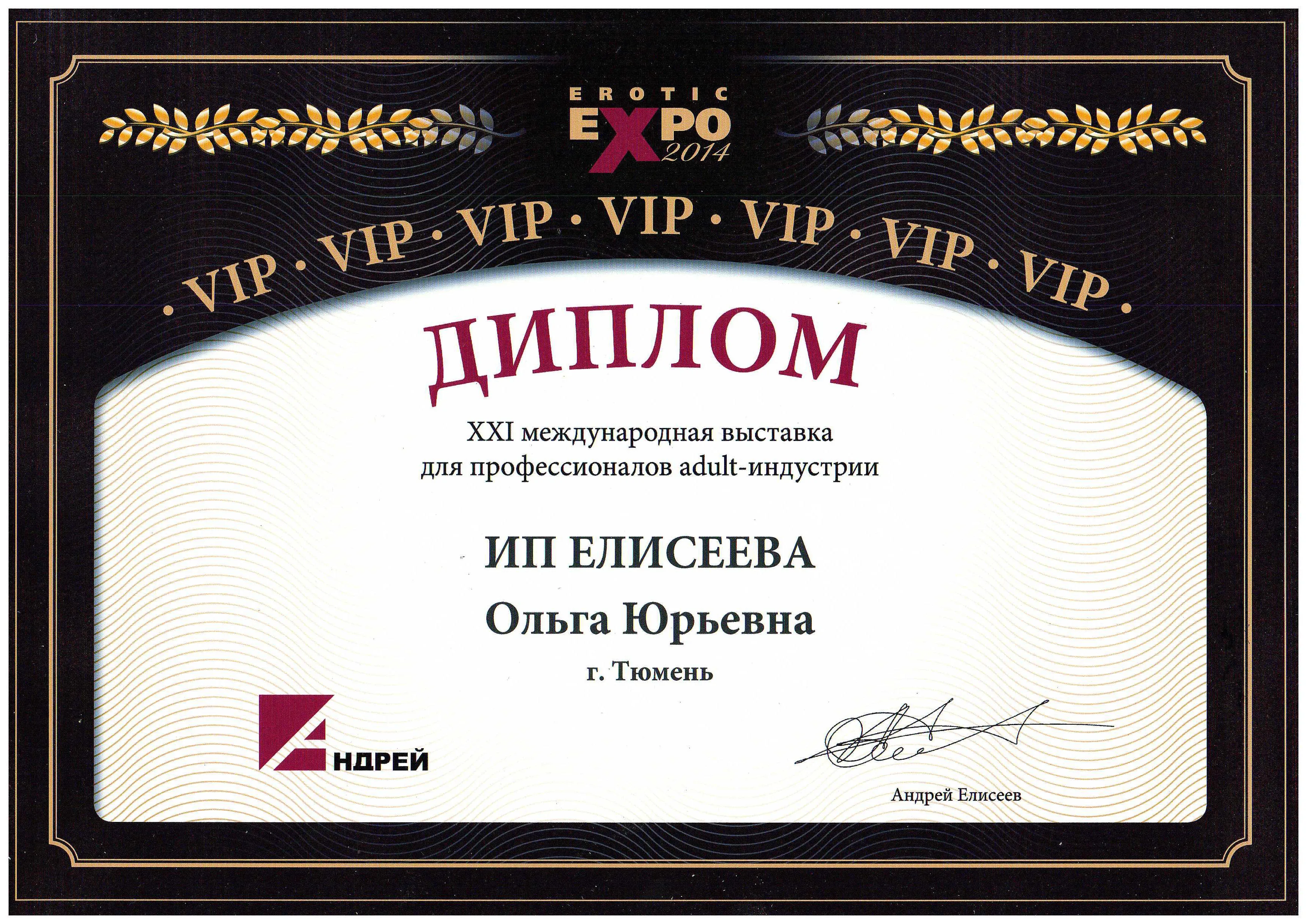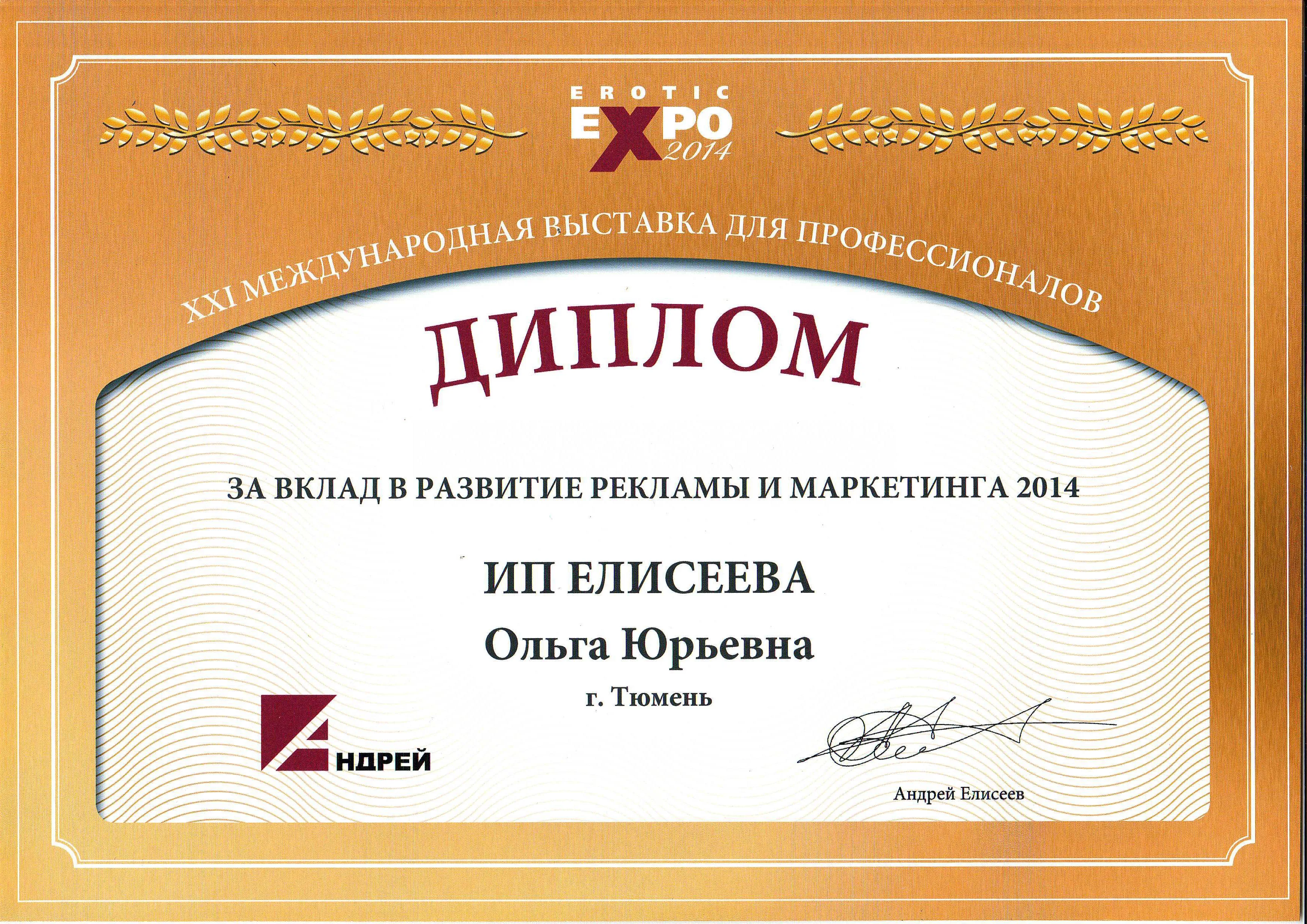 Диплом XXI международная выставка для профессионалов adult-индустрии, Erotic Expo 2014 г.