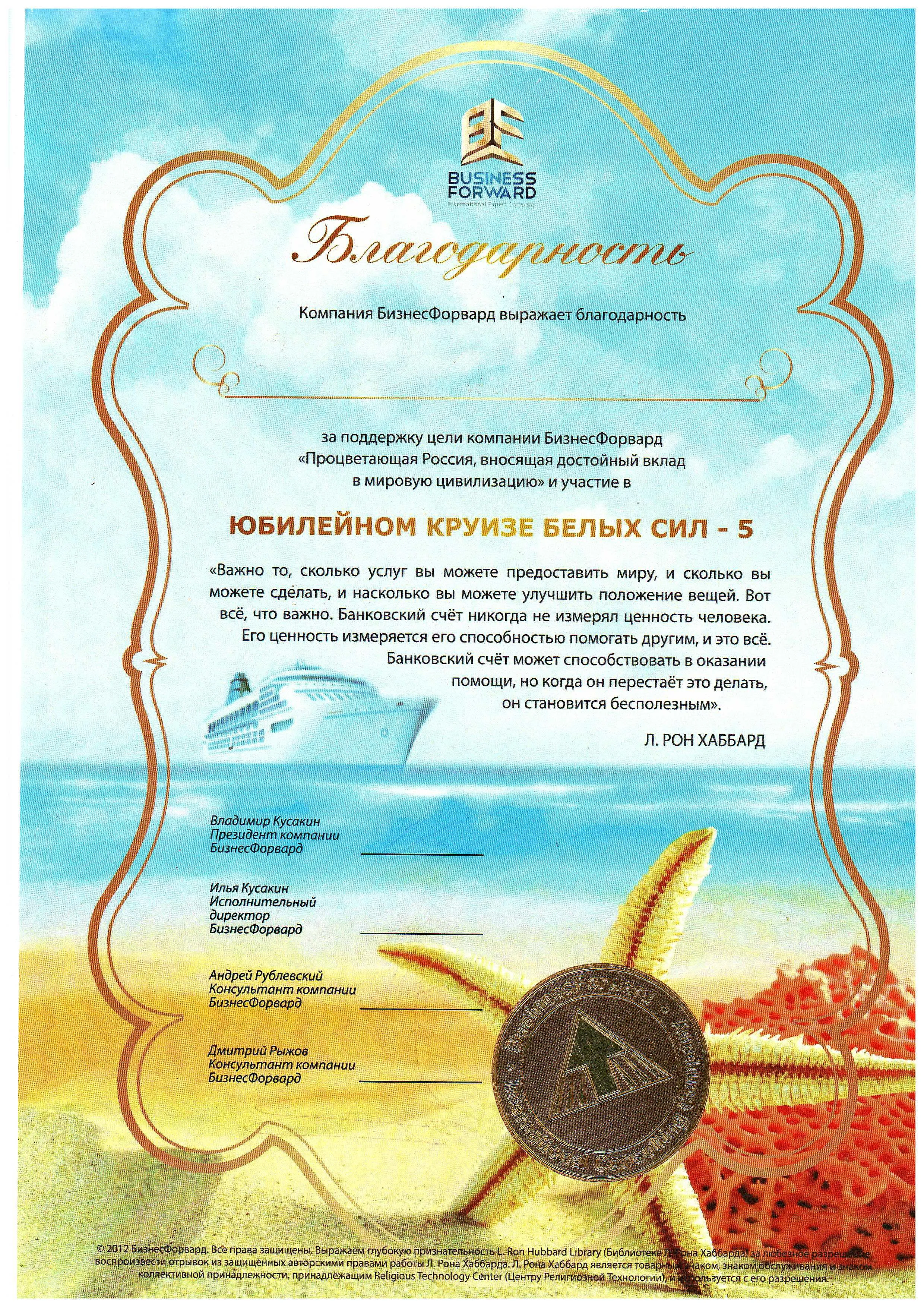 Компания "БизнесФорвард" выражает благодарность за поддержку цели компании БизнесФорвард "Процветающая Россия, вносящая достойный вклад в мировую цивилизацию" и участие в Юбилейном круизе белых сил-5.