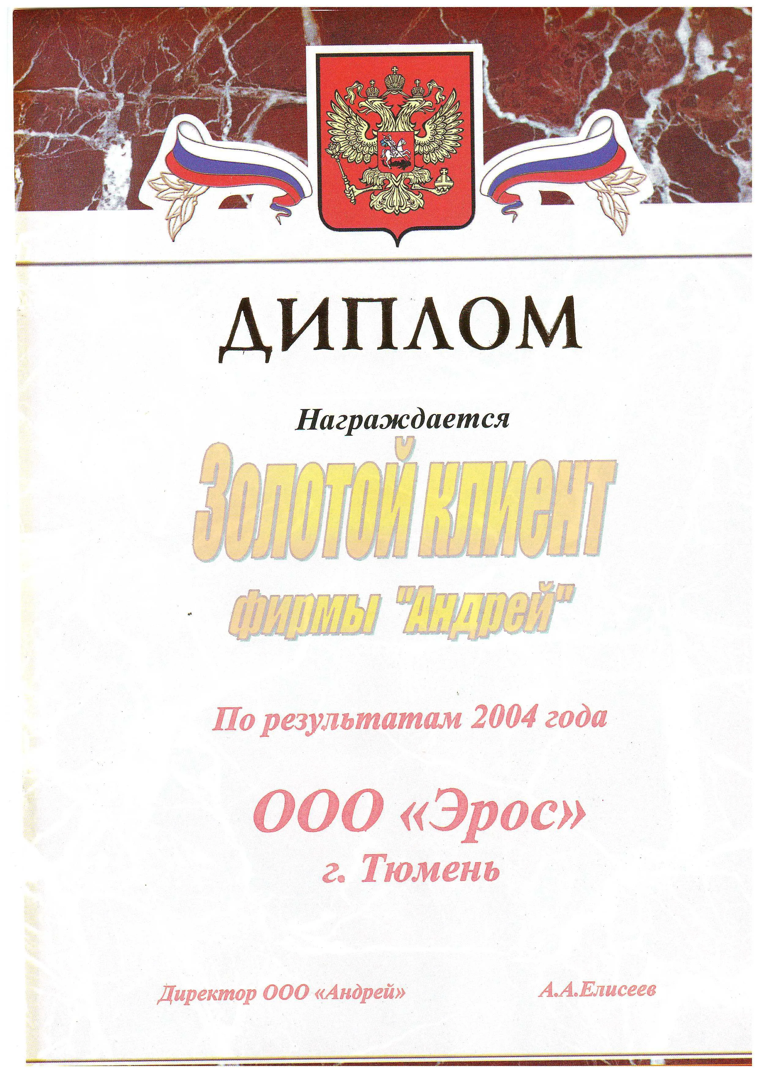 Награждается ООО "Эрос" в номинации Золотой клиент фирмы "Андрей" по результатам 2004 года.