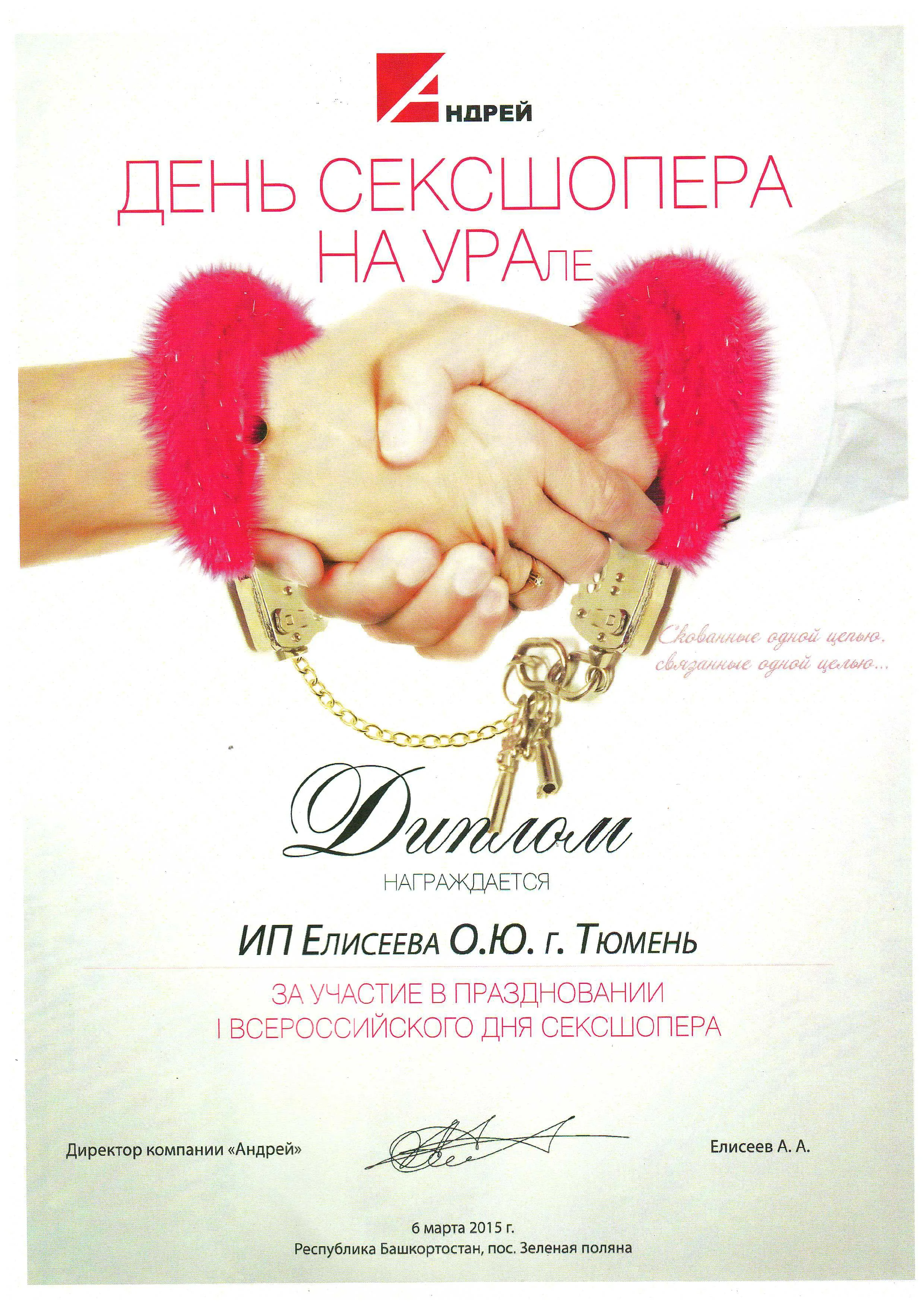 Диплом. Награждается ИП Елисеева Ольга Юрьевна, выдан за участие в праздновании I всероссийского дня секшопера, 6 марта 2015 г.
