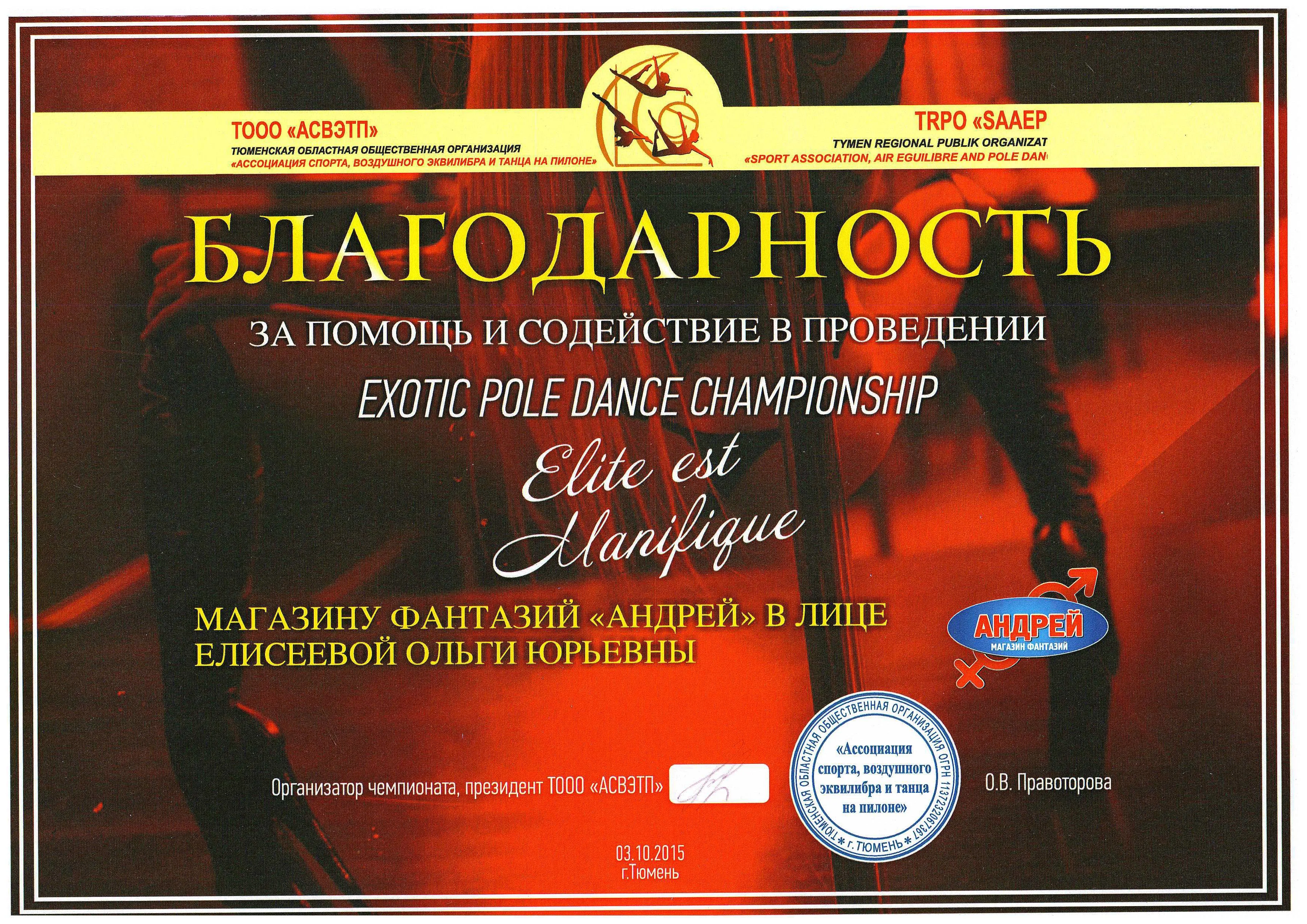 Благодарность за помощь и содействие в проведении Exotic Pole Dance Championship магазину фантазий "Андрей" в лице Елисеевой Ольги Юрьевны.