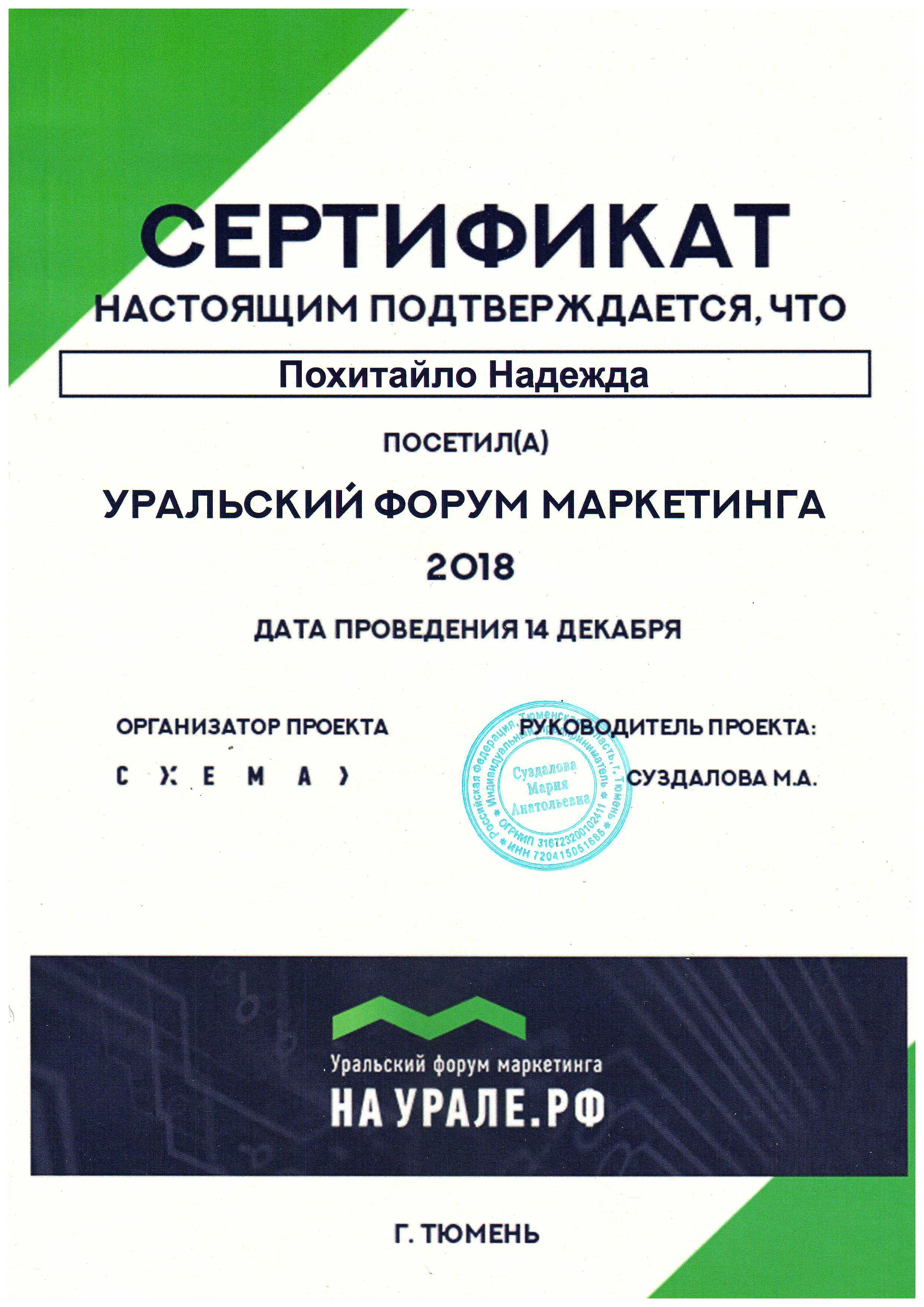 Сертификат настоящим подтверждает, что Похитайло Надежда посетила Уральский форум маркетинга 14 декабря 2018 года.