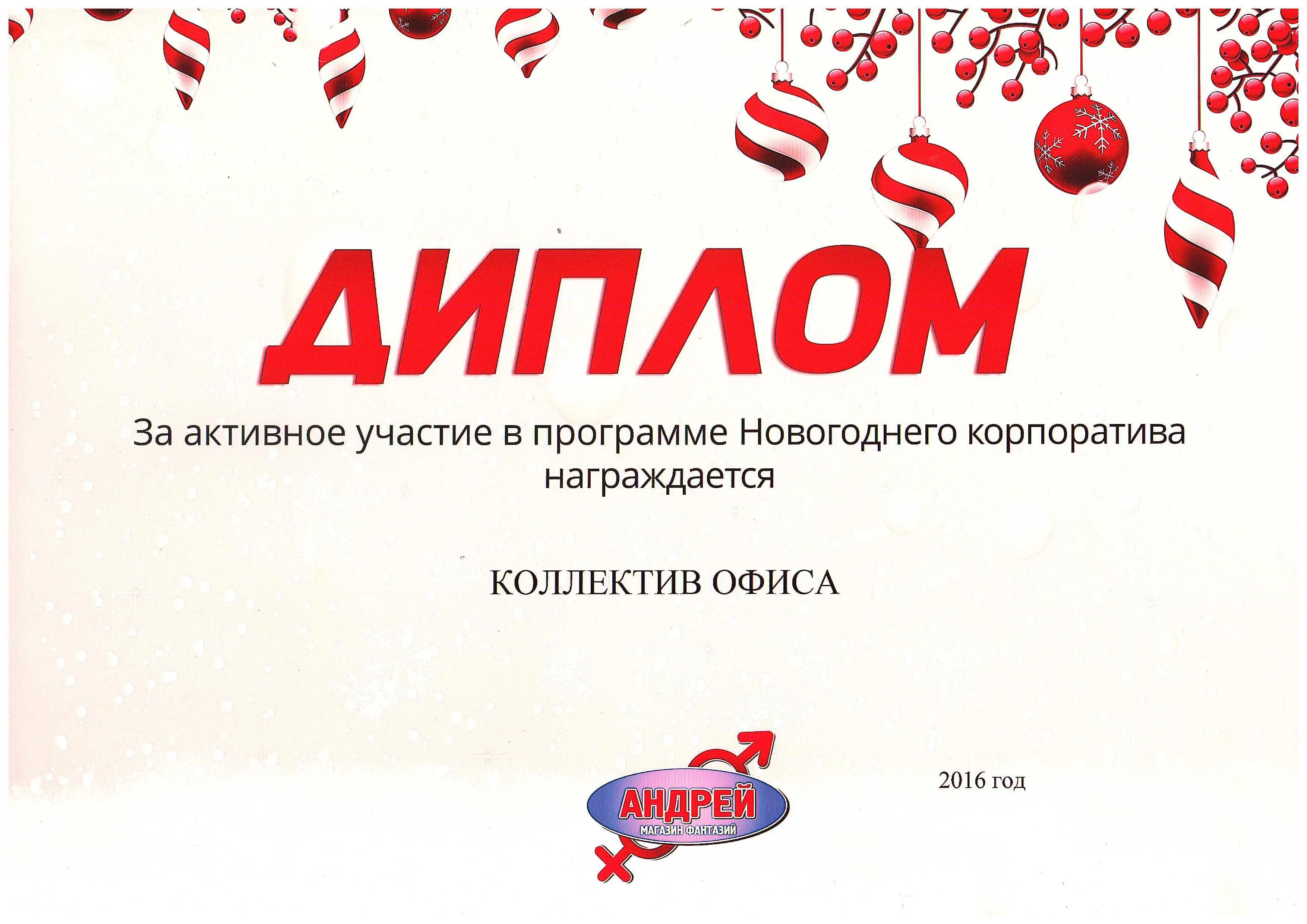 Диплом за активное участие в новогоднем корпоративе, награждается коллектив офиса "Андрей" 2016 г.