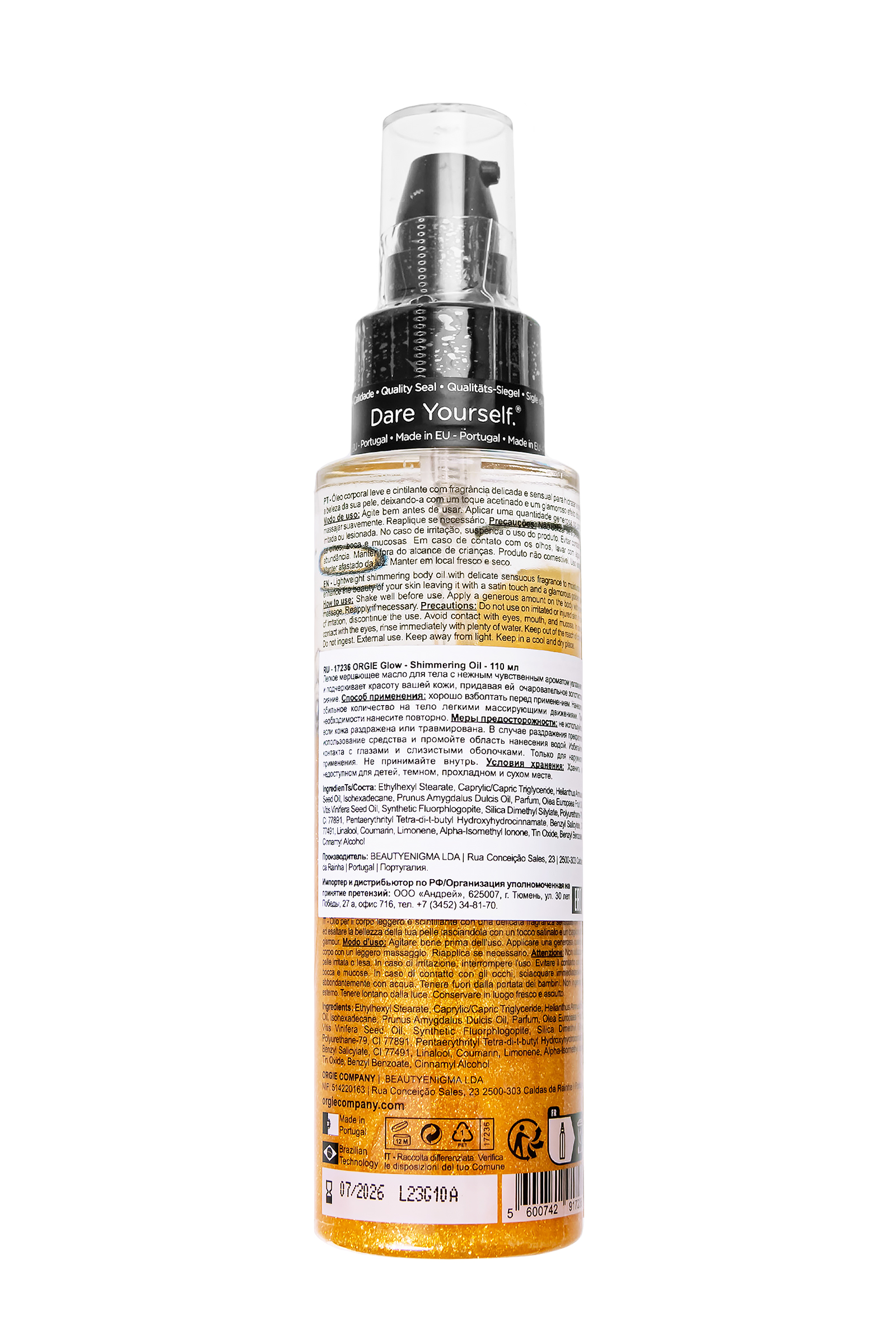 Испытайте роскошь и чувственность с легким мерцающим маслом для тела Glow Shimmering Body Oil от Орджи. Этот уникальный продукт одновременно увлажняет и дарит вашей коже чарующее золотое сияние, подчеркивая ее красоту. Глубокое увлажнение: Масло интенсивно питает кожу, оставляя её мягкой и увлажненной на долгое время. Мерцающий эффект: Придает коже изысканный блеск, создавая эффект золотого сияния, который идеально подходит для особых случаев. Чувственный аромат: Обладает утонченным ароматом, который раскрывается в три этапа: Верхние ноты: Свежие фруктовые аккорды и кокосовая сладость. Средние ноты: Экзотические восточные оттенки и нежная ванильная орхидея. Базовые ноты: Гурманские, сливочные и мускусные ноты, создающие теплую и притягательную базу. Использование: Распылите масло на чистую кожу. Особое внимание уделяйте областям, которым хотите придать сияние. Подходит для: Повседневного использования и для создания особенного образа на вечеринках или романтических встречах. Побалуйте себя и свою кожу с Glow Shimmering Body Oil от Orgie, ощутив непревзойденное увлажнение и восхитительное мерцание. Празднуйте красоту с Orgie. Orgie – это не просто бренд интимной косметики, это бразильский гимн любви и наслаждению. Продукция Orgie, созданная с использованием натуральных афродизиаков и инновационных формул, пробуждает чувственность и дарит незабываемые ощущения как в интимной близости с партнером, так и в сольном путешествии к самопознанию. Orgie – это философия, призывающая ценить и исследовать все грани интимности, делая каждый момент незабываемым.